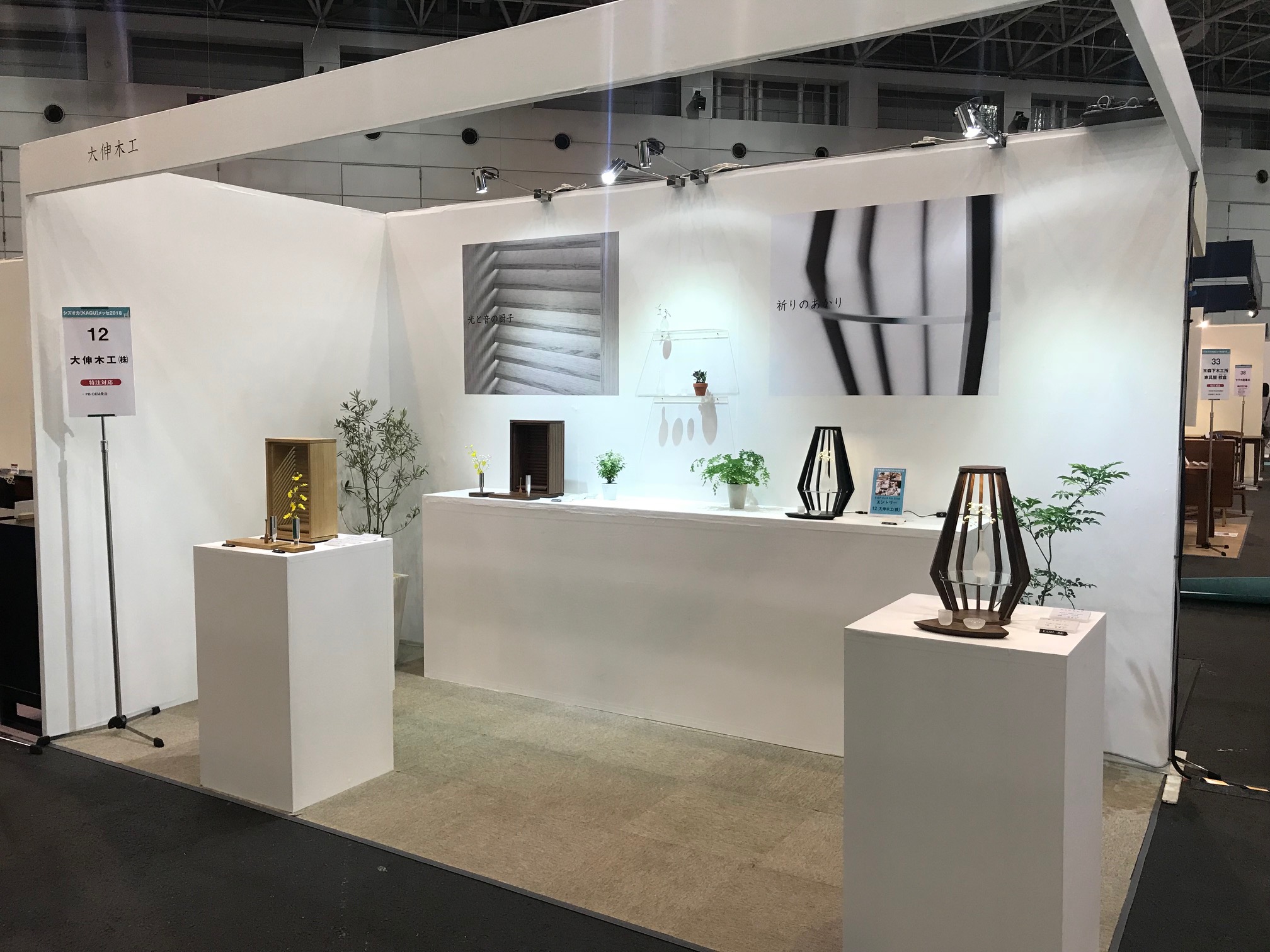 大伸木工さんの展示ブースでは、つなぐデザインで開発した「祈りのあかり」を展示いたしました。