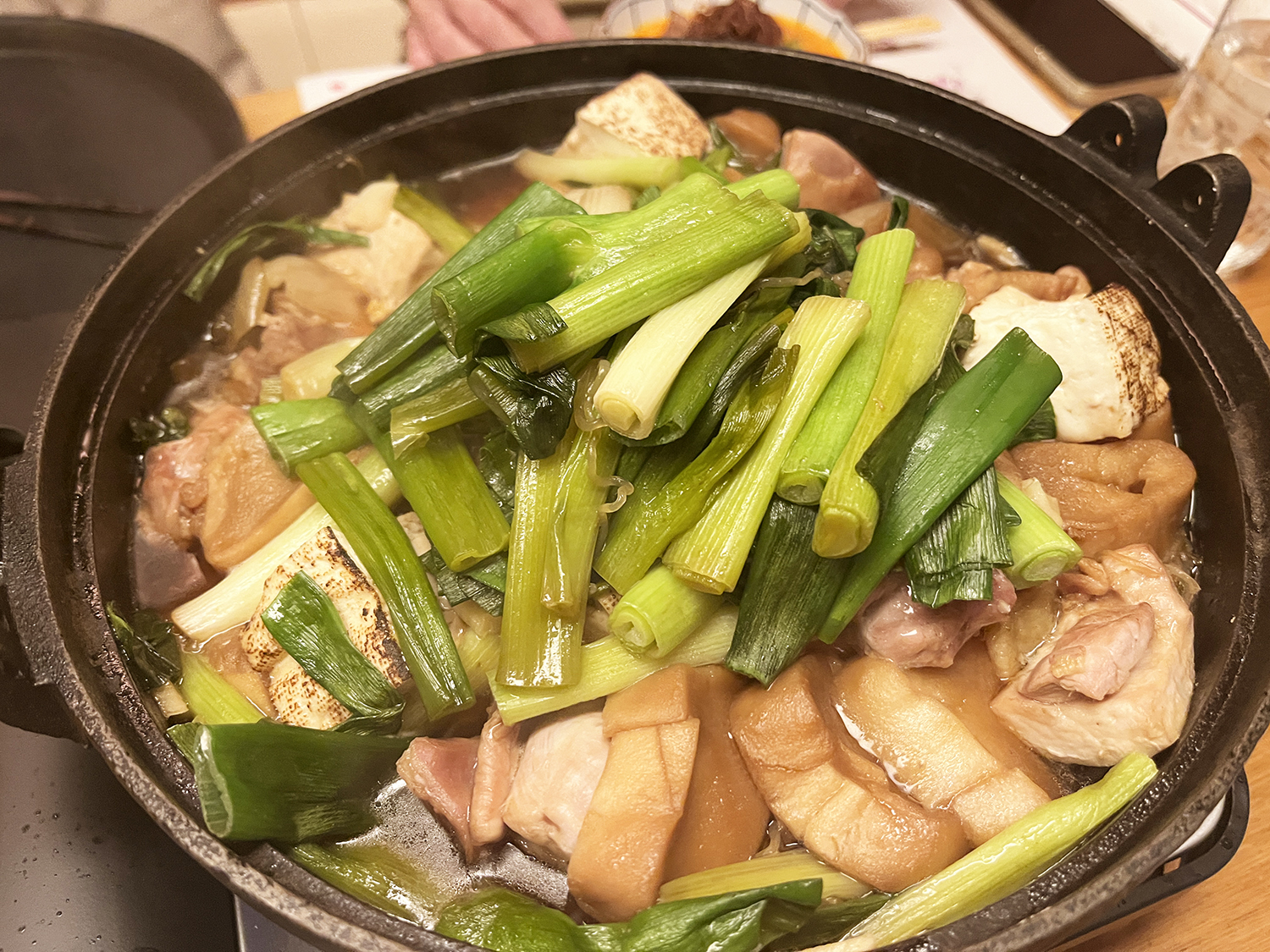 初めてのビジュアルにびっくりしましたが、煮えてくるとしんなりしたネギの間からもちもちの鶏肉、焼き豆腐、お麩、白滝などが見えてきます。